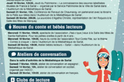 Programme de février 2026 dans les médiathèques Expositions, conférences, animations et clubs de lecture Le réseau des médiathèques Sarlat-Périgord Noir propose, tout au long de février 2026, un programme d’animations