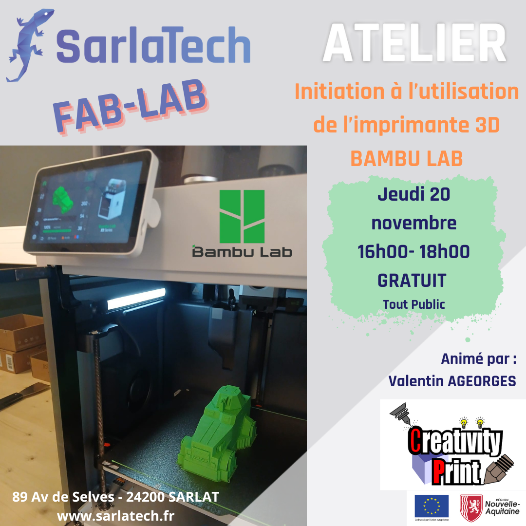 Cet atelier, animé par Valentin de CREATIVITY PRINT, a pour objectif de faire découvrir de manière simple et concrète le fonctionnement d’une imprimante 3D Bambu Lab.