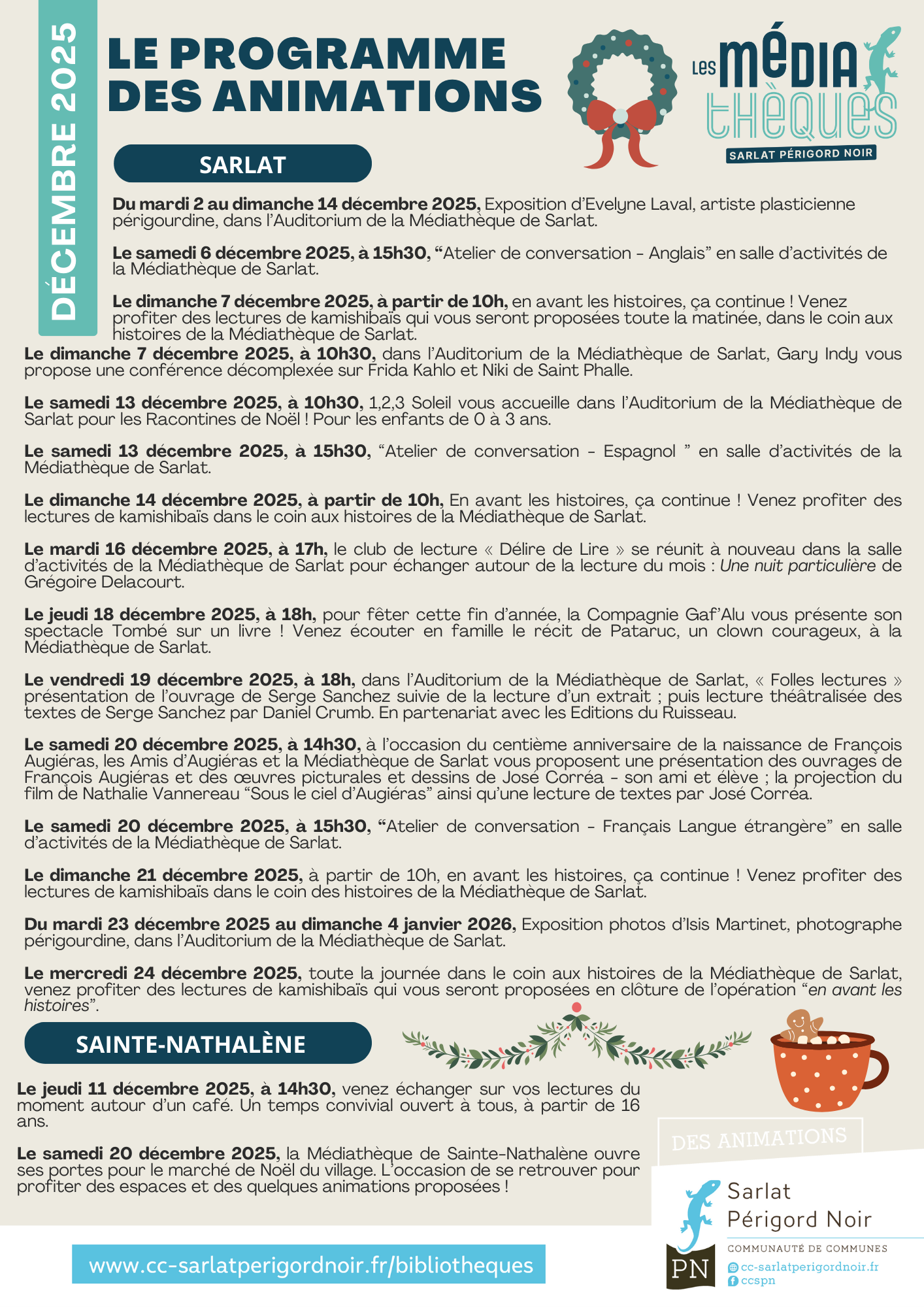 En décembre, pour clore l’année en beauté, les Médiathèques Sarlat-Périgord Noir proposent un programme riche et varié pour tous les âges : lectures, peinture, langues, racontines, photographie et spectacle, se dérouleront à Sarlat et Sainte-Nathalène.