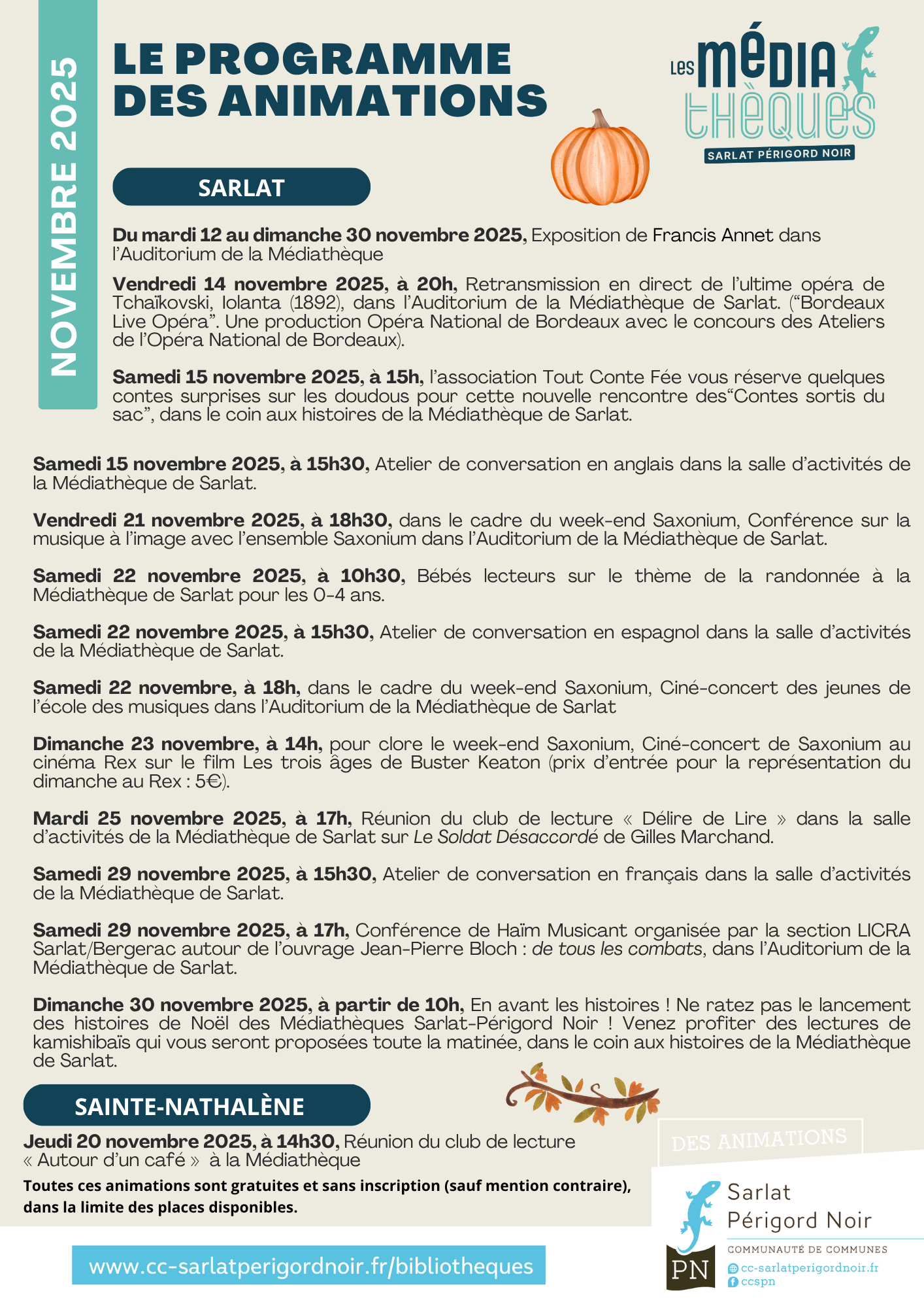 Samedi 29 novembre 2025, à 15h30, Atelier de conversation en français dans la salle d’activités de la Médiathèque de Sarlat.