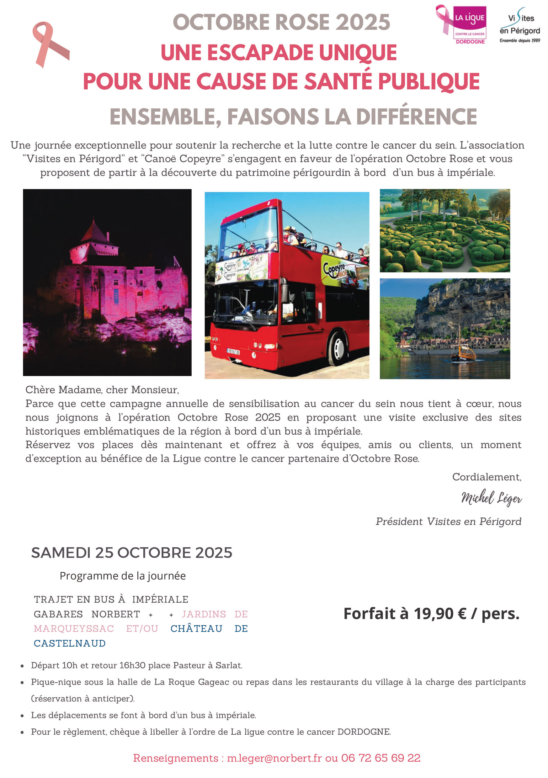 Une journée exceptionnelle pour soutenir la recherche et la lutte contre le cancer du sein. L’association « Visites en Périgord » et « Canoë Copeyre » s’engagent en faveur de l’opération Octobre Rose et vous proposent de partir à la découverte du patrimoine périgourdin à bord d’un bus à impériale.
