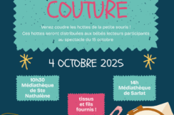 Venez coudre les hottes de la petite souris ! Ces hottes seront distribuées aux bébés lecteurs participants au spectacle du 15 octobre Tempi Temtoa Renseignement : Médiathèque de SARLAT 7 Rue Jean Baptiste Delpeyrat,